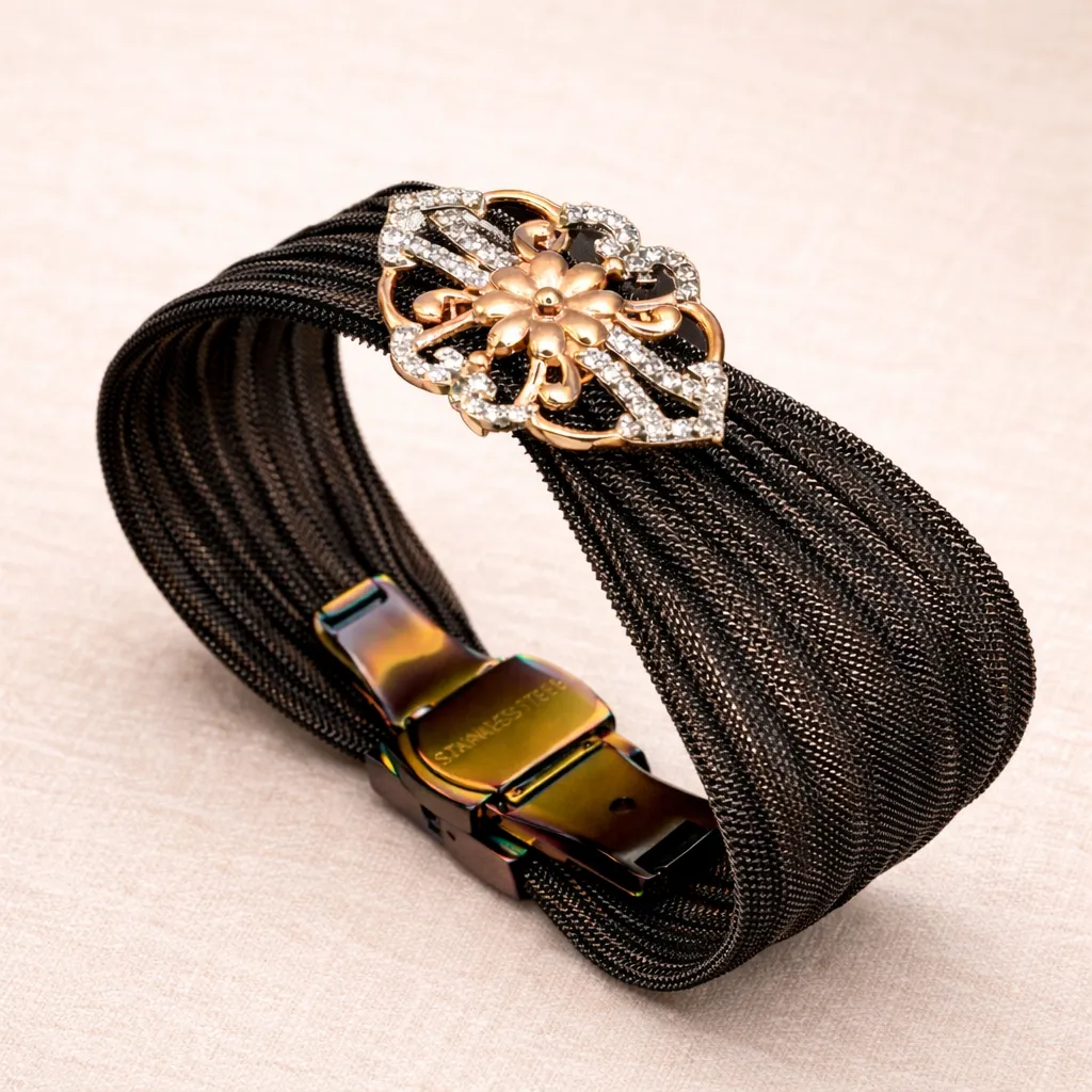 Elegant Flower Crystal Black Cuff Bracelet | 30 Mm | 925 Sterling Silver